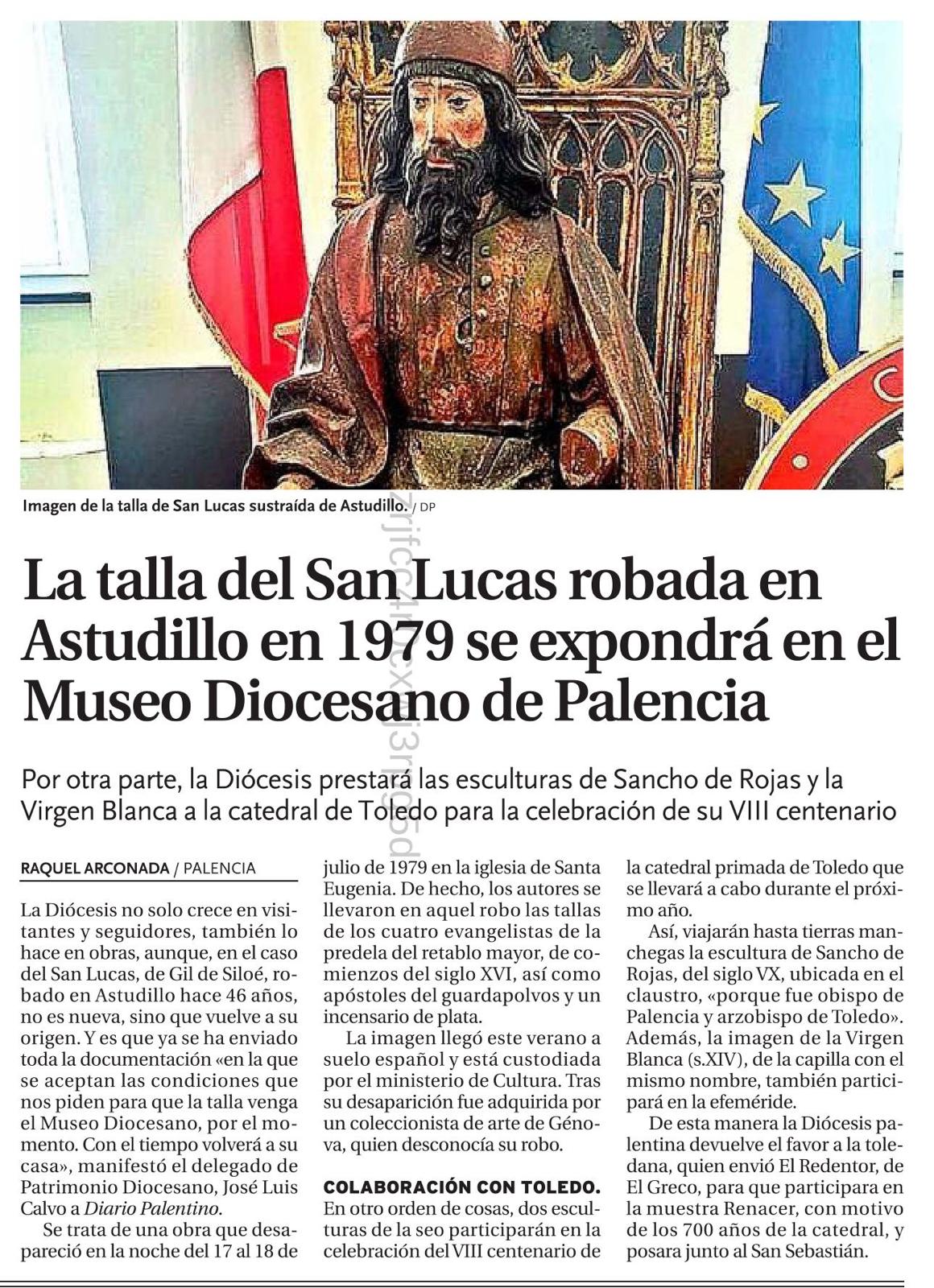 La talla del San Lucas robada en Astudillo en 1979 se expondrá en el Museo Diocesano de Palencia